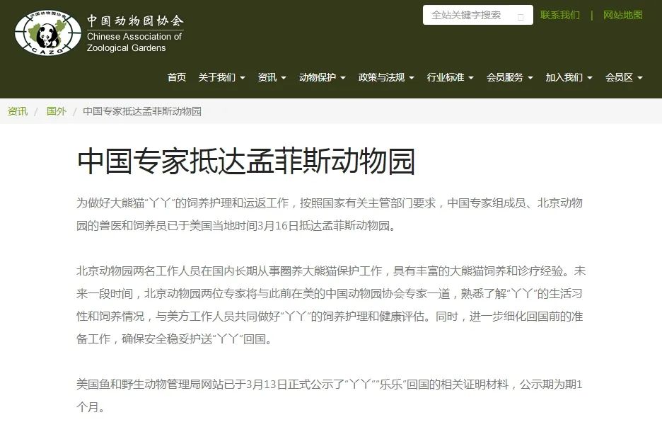 据中国动物园协会网站消息,为做好大熊猫“丫丫”的饲养护理和运返工作,按照国家有关主管部门要求,中国专家组成员、北京动物园的兽医和饲养员已于美国当地时间3月16日抵达孟菲斯动物园。