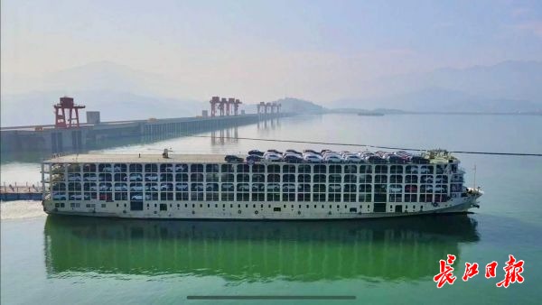 满装汽车的轮船通过世界最大的内河升船机翻过三峡大坝。特派记者范芃 摄