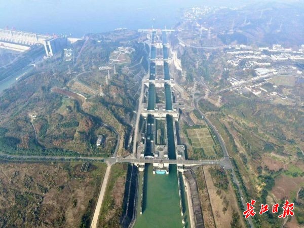 三峡双线五级船闸让万吨巨轮“爬楼梯”翻坝。特派记者范芃 摄