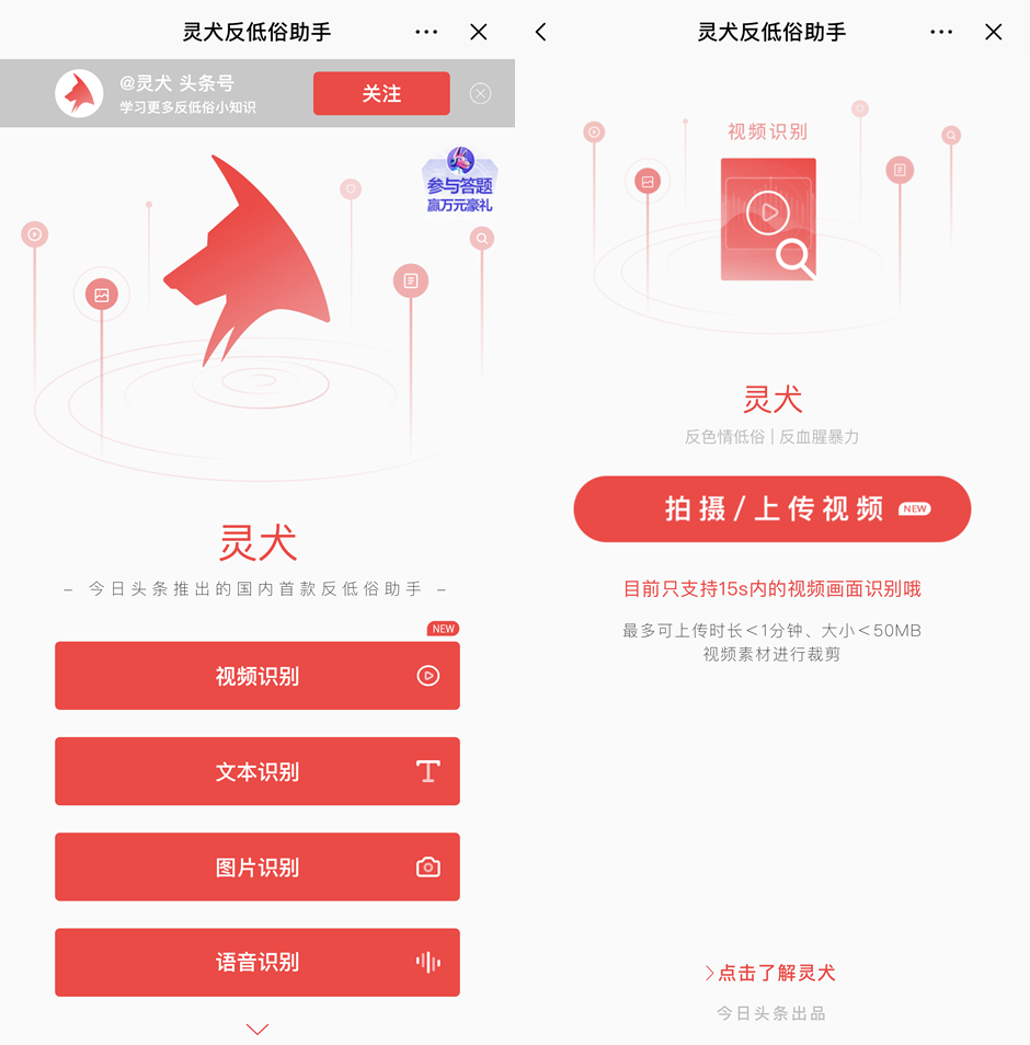 目前,“灵犬”已实现支持视频识别、文本识别、图片识别和语音识别,覆盖当今网络所有主流的内容类型。用户只要打开今日头条搜索“灵犬反低俗助手”,输入视频、文字、图片、语音等内容,“灵犬”即可在几秒钟内检测出其健康指数。