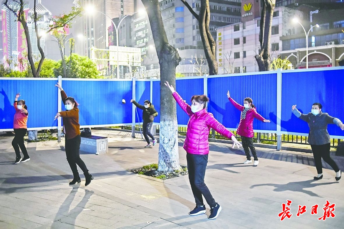 4月2日,汉口新华路一个被围挡封闭的社区广场上,几名居民戴着口罩跳广场舞。 记者任勇 摄
