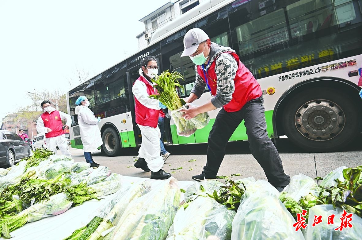 3月13日,江岸区铁南社区,志愿者正在接力卸下团购的菜品。记者郭良朔 摄