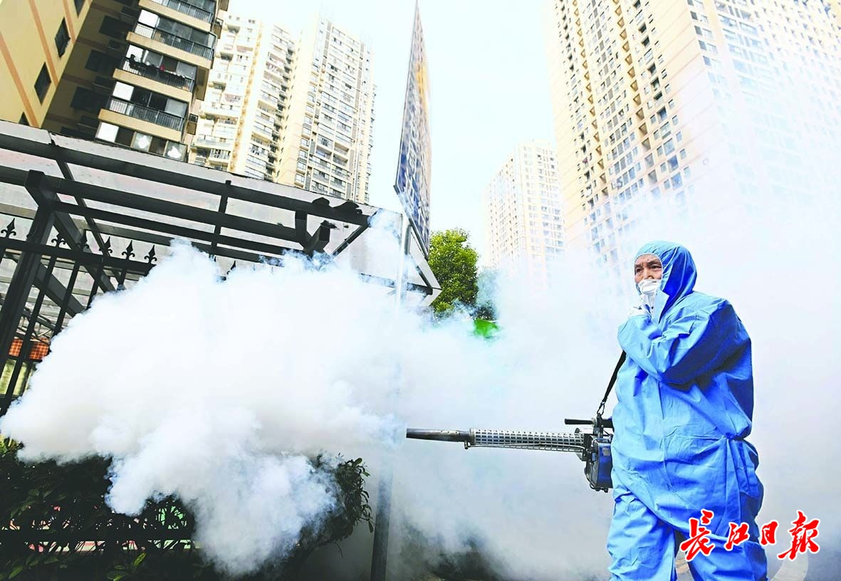 2月4日,东湖高新区关东街道关山社区工作人员肩挎烟雾消杀器在光谷青年城展开消杀。记者高勇 摄