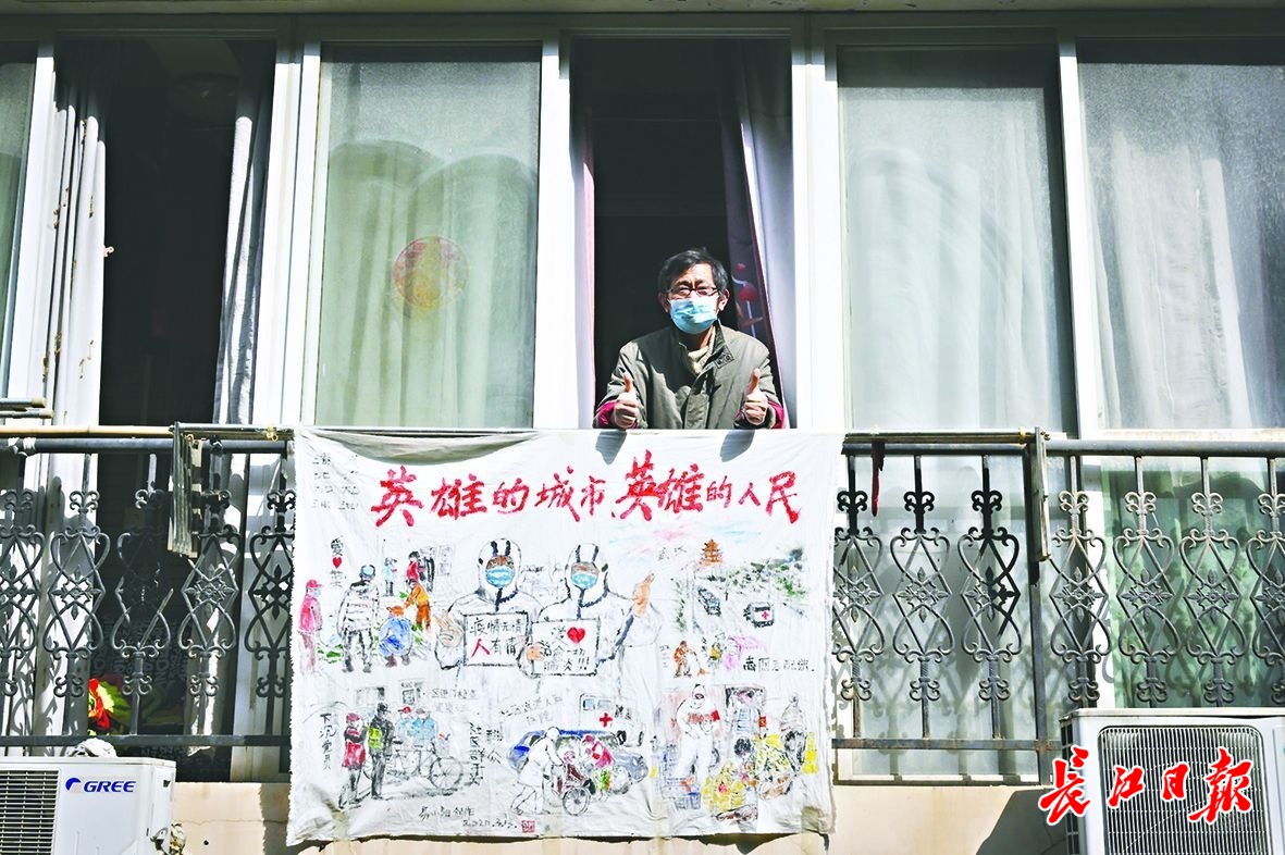 3月14日,东西湖区常安佳苑小区,退休美术教师易小阳在宽2米的白布上绘制美术作品《英雄的城市 英雄的人民》,为武汉加油。记者金思柳 摄