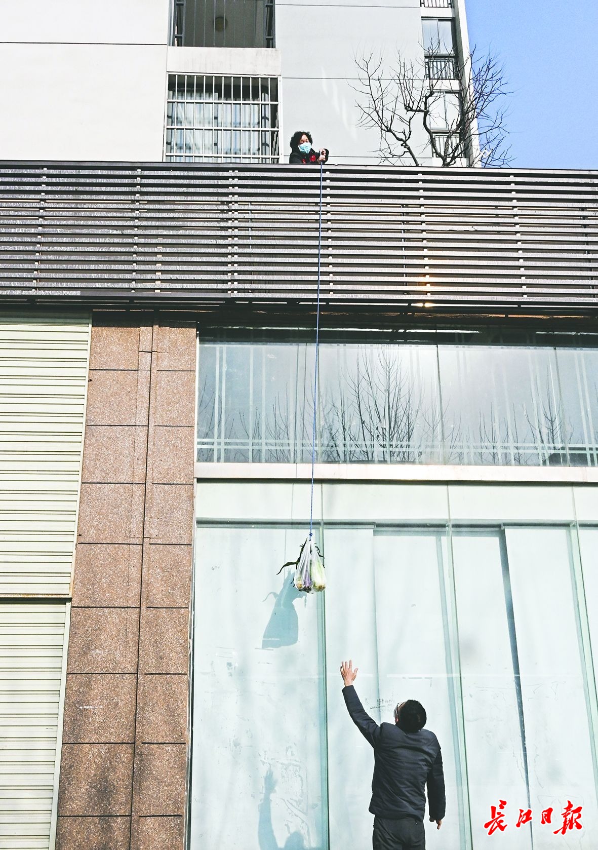 2月22日,市民张先生将团购的新鲜蔬菜包好后,让母亲用绳子吊上楼带回家。记者金思柳 摄