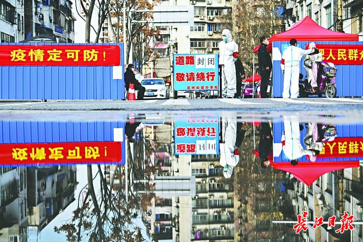 2月29日,汉口三眼桥北路和三眼桥路口,社区干部、城管队员和下沉干部在小区门口值守。记者詹松 摄