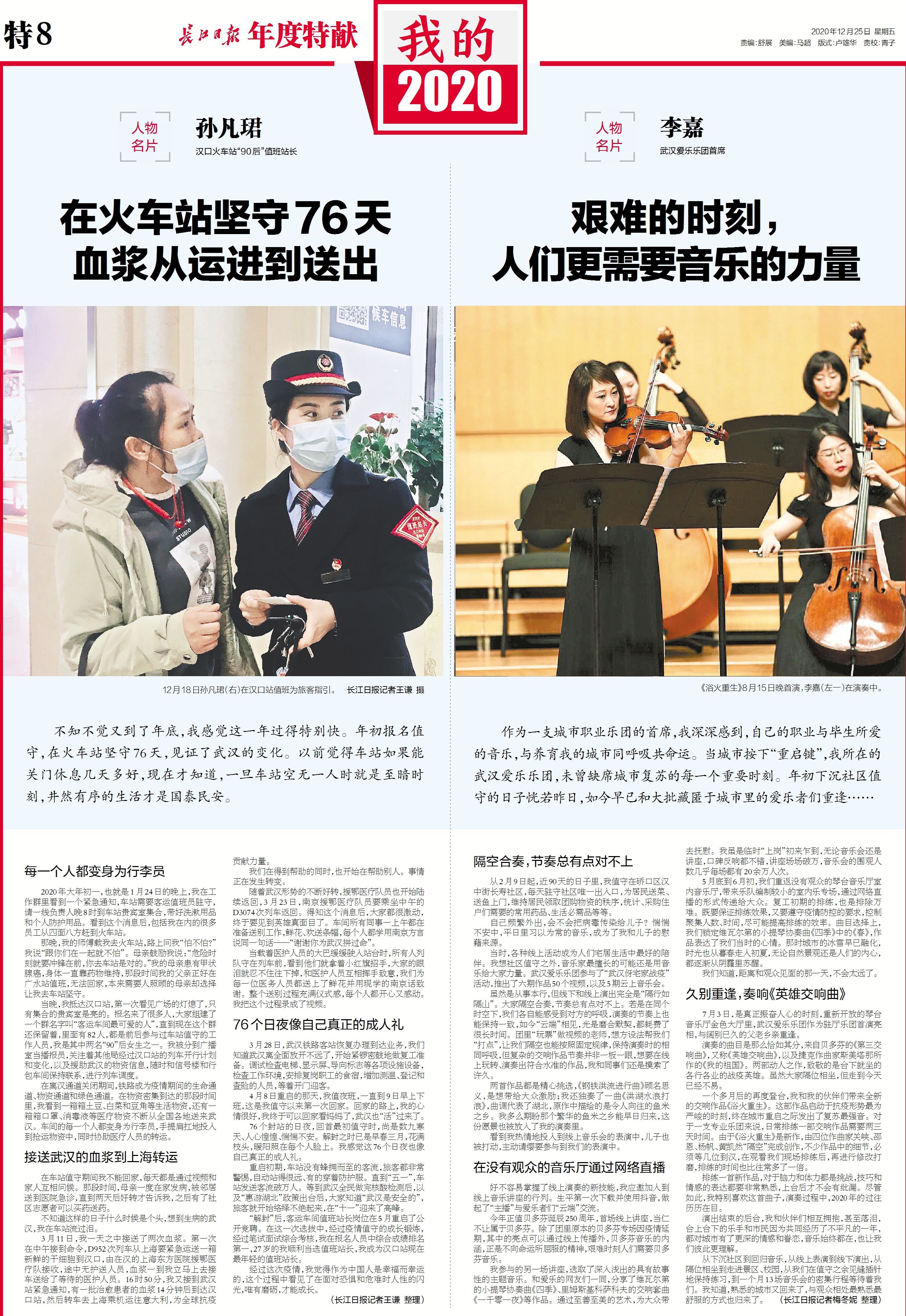 两首作品都是精心挑选,《钢铁洪流进行曲》顾名思义,是想带给大众激励;我还独奏了一曲《洪湖水浪打浪》,曲调代表了湖北,原作中描绘的是令人向往的鱼米之乡。我多么期盼那个繁华的鱼米之乡能早日归来,这份愿景也被放入了我的演奏里。