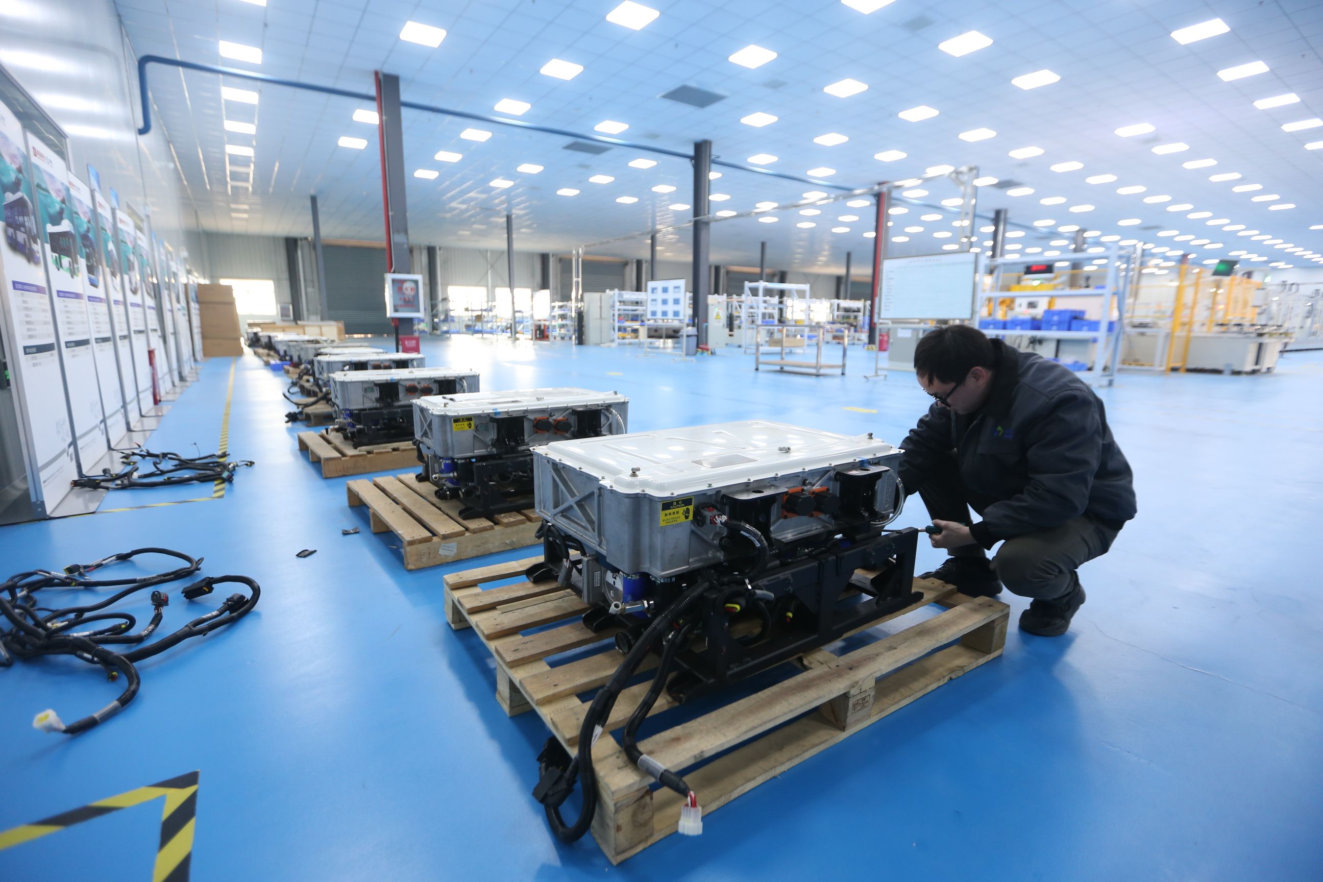 工作人员对即将出厂的燃料电池进行检查。 记者杨涛 摄