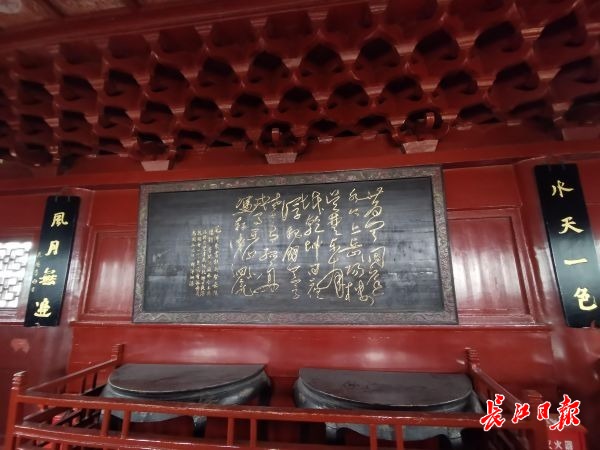 岳阳楼内至今高悬的毛泽东手书杜甫诗《登岳阳楼》。特派记者柯立 摄