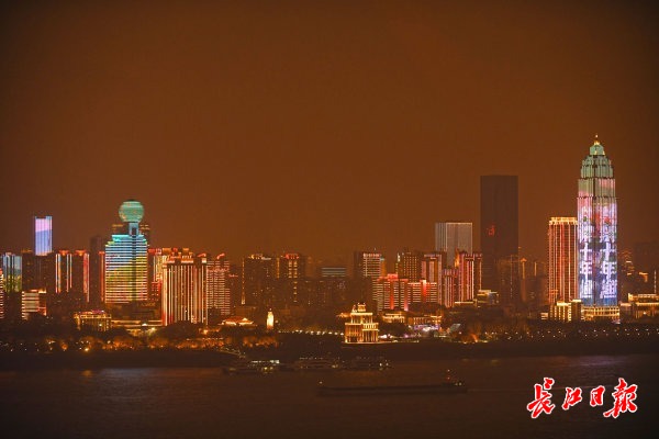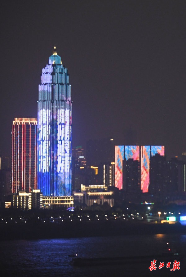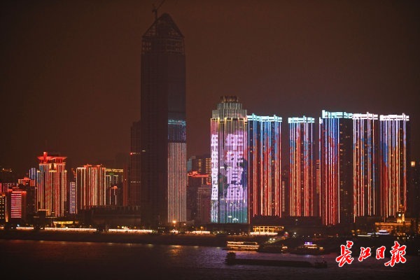 长江日报-长江网12月29日讯 “长江十年禁渔,为全局计、为子孙谋”“爱护长江,从我做起”“同饮长江水,共禁十年渔”“禁捕退捕全民参与,千秋万代年年有鱼”“织牢长江生态保护网,打赢十年禁渔持久战”……2020年12月29日晚,“长江十年禁渔”灯光秀开启,武汉长江两岸高楼上轮流打出宣传语,让全社会更好地了解长江十年禁渔的重大意义。(记者苗剑 摄影报道)