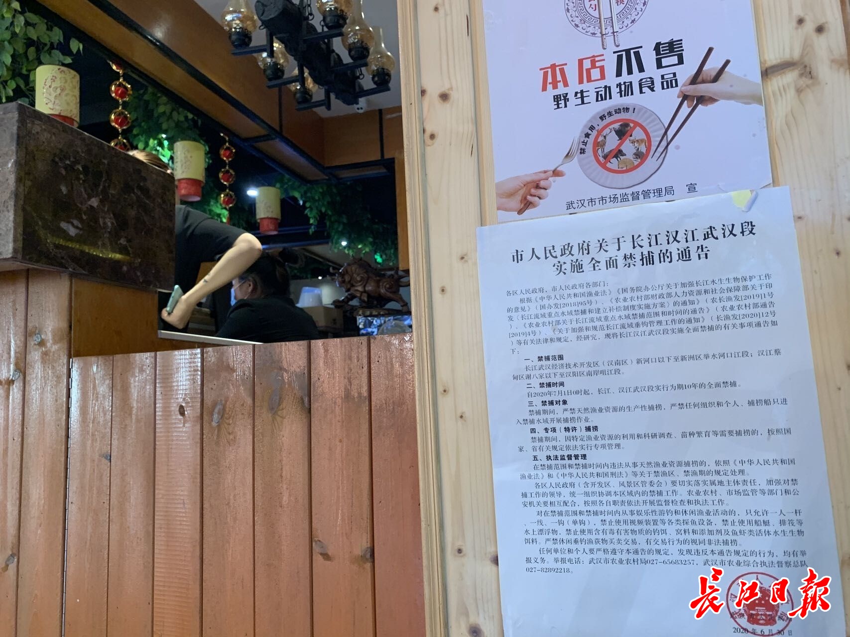 餐厅贴出“不售野生动物食品”的承诺。记者尹勤兵 摄