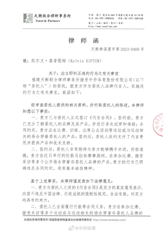 中乔体育的声明中称,凯尔文·基普图姆在伦敦马拉松赛上穿着非中乔体育品牌装备的违约行为,公司已委托律所向代言人发出律师函,要求其纠正违约行为。
