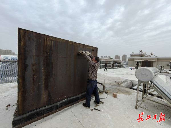 29日9时许,长江日报记者赶到该小区时,施工方正着手开展水箱拆除工作。记者爬上楼顶看到,施工人员正在对两个铁质水箱进行破拆。