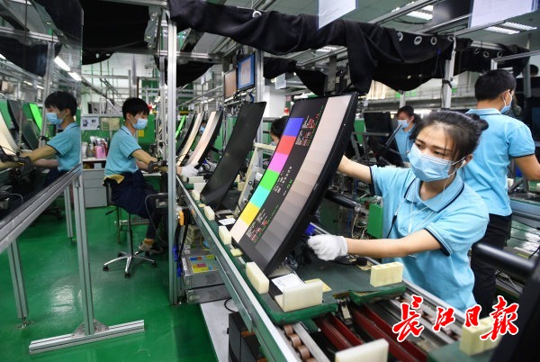 冠捷显示科技(武汉)有限公司生产线上,员工正在紧张忙碌着。记者高勇 摄