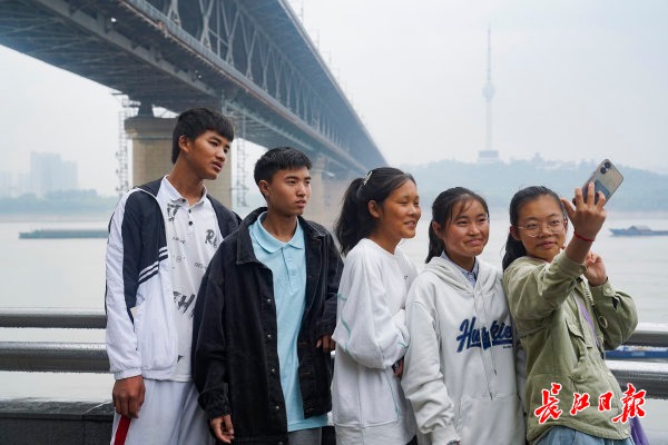 天空下着小雨,孩子们丝毫没有受到雨天的干扰,大家站在长江大桥桥头堡,举着手机拍下雄伟的大桥和波涛汹涌的江水。火车从桥上呼啸而过, 14岁的周敏霞指给支教老师严宇飞看:“你看你看,上面跑汽车,下面跑火车。”周敏霞说,严老师是她的地理课老师,第一节课上,严老师就向他们介绍了武汉长江大桥。她说:“当时听严老师讲,武汉长江大桥是新中国第一座公铁两用大桥,我想象不到一座大桥到底有多壮观,现在我看到了。”