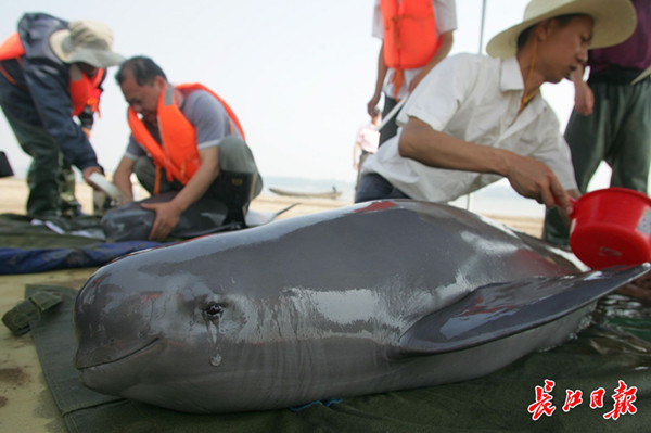 2011年5月22日,长江中下游遭遇百年不遇旱灾,江豚活动水域缩小,科学家救助时,长江江豚流下焦虑的“眼泪”。 (资料图)