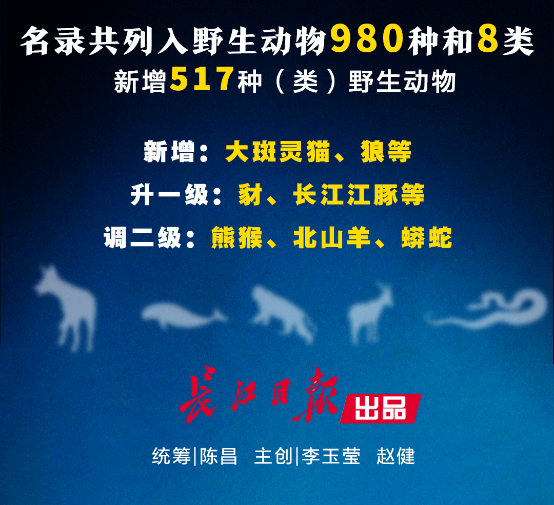 长江日报-长江网2月5日讯(记者高宝燕)2月5日,经国务院批准,国家林业和草原局、农业农村部调整的《国家重点保护野生动物名录》(以下简称《名录》)正式向公众发布。长江江豚等65种由国家二级保护野生动物升为国家一级,熊猴等3种降为国家二级保护野生动物。这是1989年以来,我国野生动物保护名单第一次大规模调整。