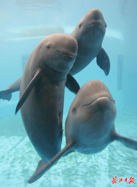 长江江豚升为国家一级保护动物,但保护形势依然严峻。图为2006年11月,江豚淘淘一家最后的合影。图中下方江豚妈妈已经怀了小豚,但产后病逝,小豚也夭折,江豚爸爸也于2017年病逝。 记者高宝燕 摄
