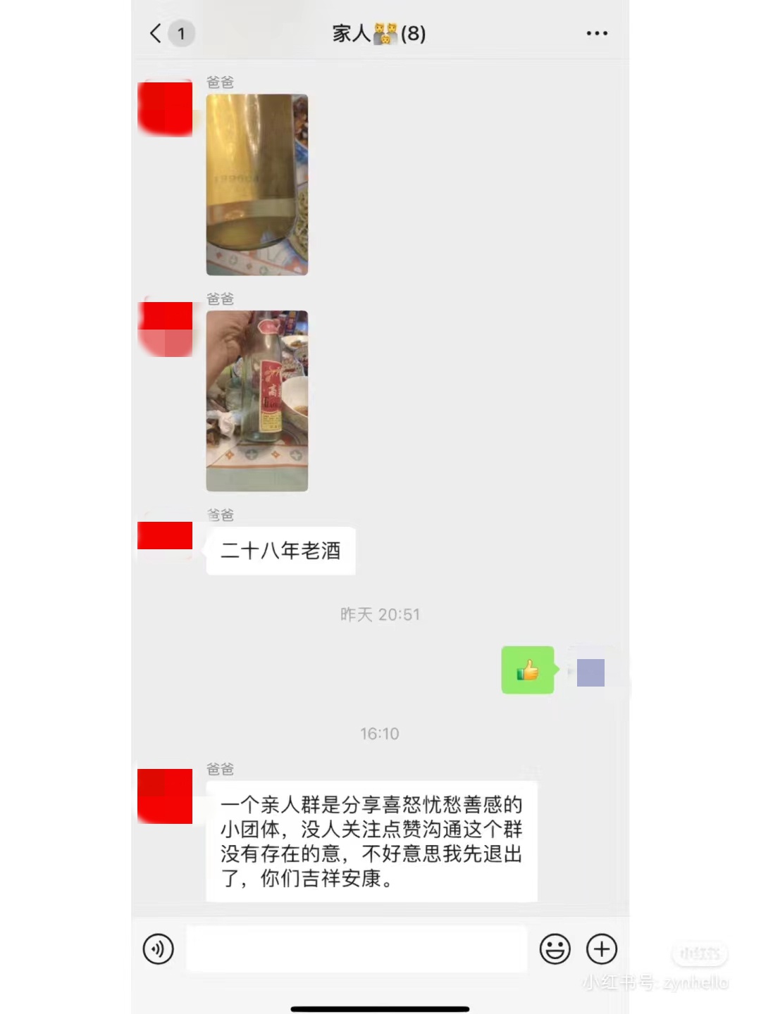 内蒙古的一位爸爸因为在群里分享生活时无人回应,决定退出家族群。离开前,他在群里留下一段话,“一个亲人群是分享喜怒忧愁善感的小团体,没人关注、点赞、沟通,这个群没有存在的意(义),不好意思我先退出了,你们吉祥安康。”