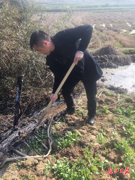 罗喜庆用铁锹把烧过的地方进行翻土覆盖。 记者戴红兵 摄
