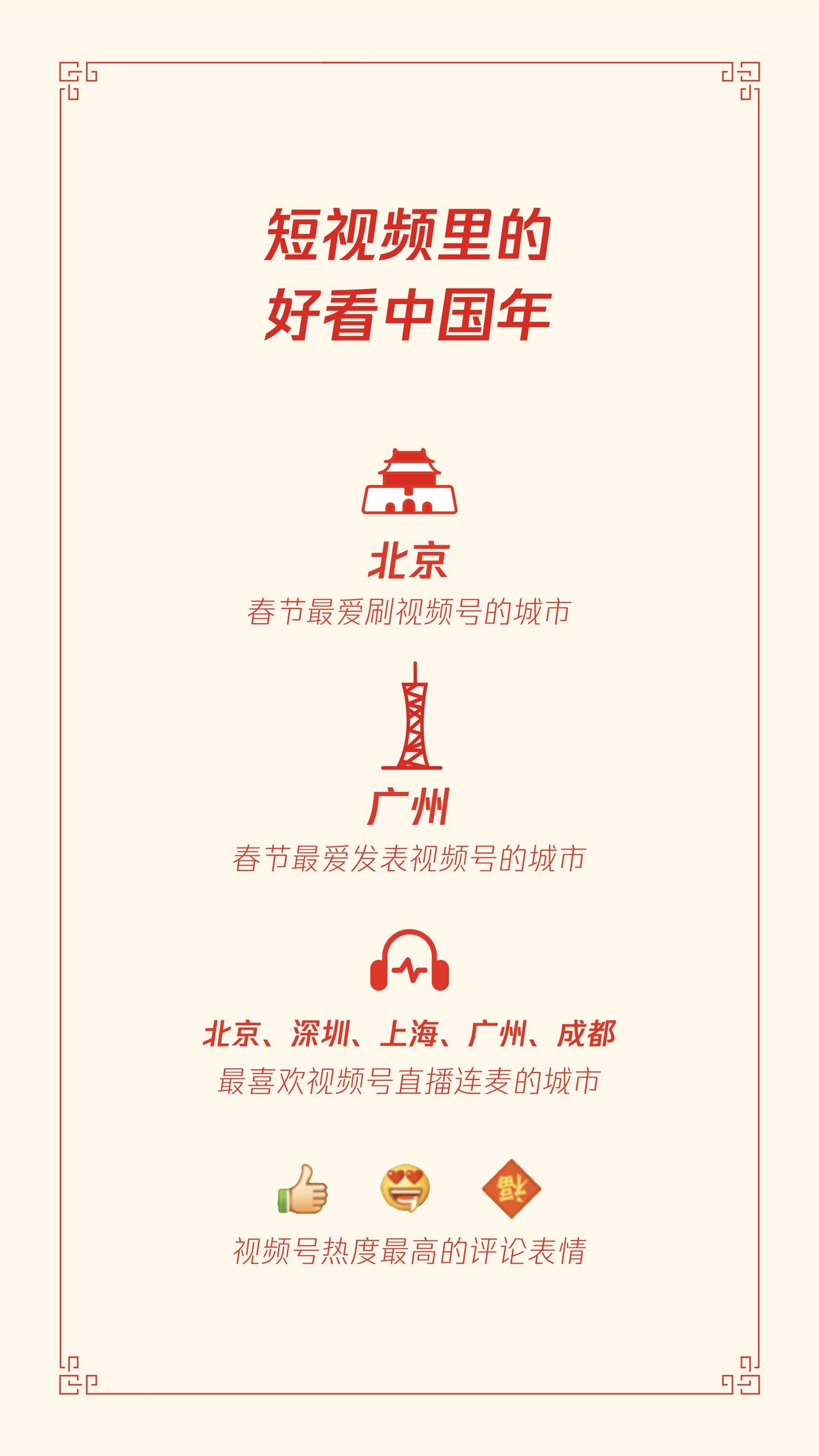 除发送微信拜年红包外,无法当面送上祝福的“原年人”,也会选择通过视频号录制短视频为远方的亲友送上新春祝福。其中北京人最爱刷视频号,广州人则最爱发视频号。视频号的直播连麦功能提供了别开生面的拜年方式,北京、深圳、上海、广州、成都成为了最喜欢直播连麦的5个城市。