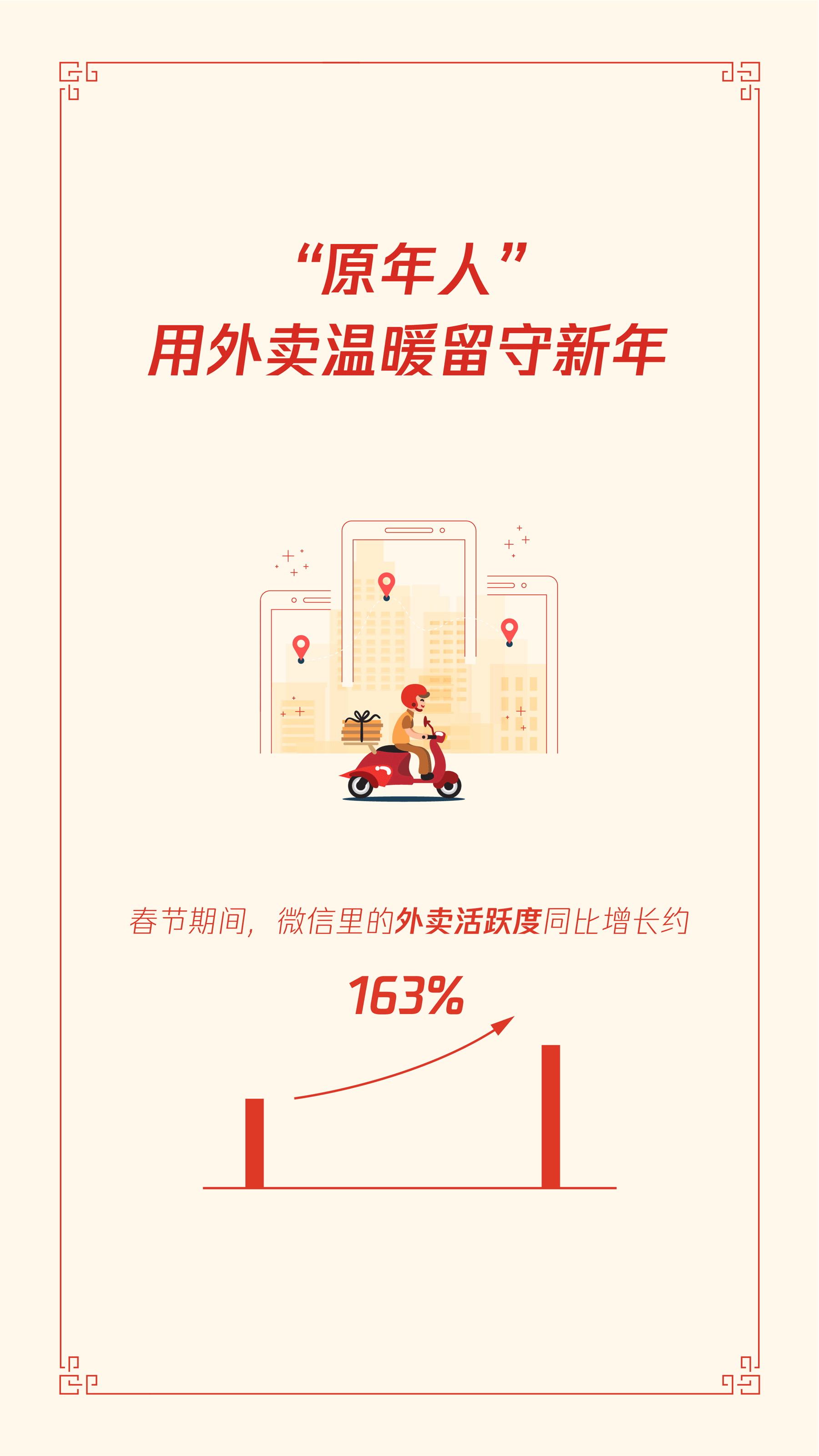 红包封面新玩法成了隔空传递祝福的“利器”,微信用户人均拥有7.37款红包封面;“原年人”也选择用外卖和“云逛街”温暖留守春节,春节期间微信里的外卖活跃度同比增长163%,百货及购物中心、餐饮小程序访问次数同比增长6倍、4.5倍;企业微信也帮助不少“不打烊”的企业保持在线,帮助企业服务约1亿微信用户。