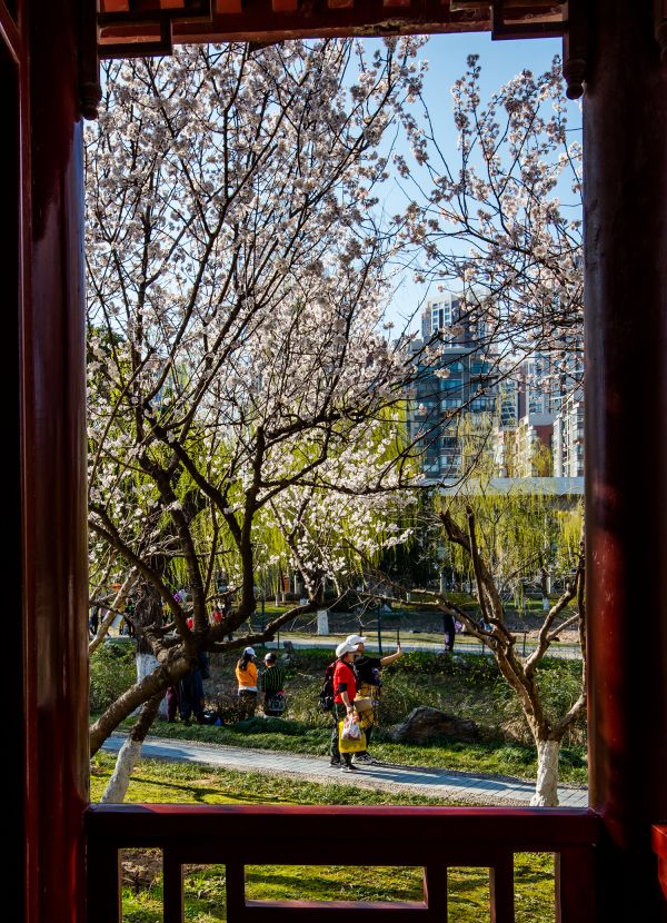 解放公园的郁金花展,是市民的宠儿,趁着天气晴好,更是迎来市民和游客在郁金香花丛中合影。从无人机的角度俯瞰郁金香花丛,又是另外一种五彩斑斓的景象。街头、公园、路边的红叶李、白玉兰都开了,在阳光下舒展地张开花瓣,这是真正的灿烂如花。