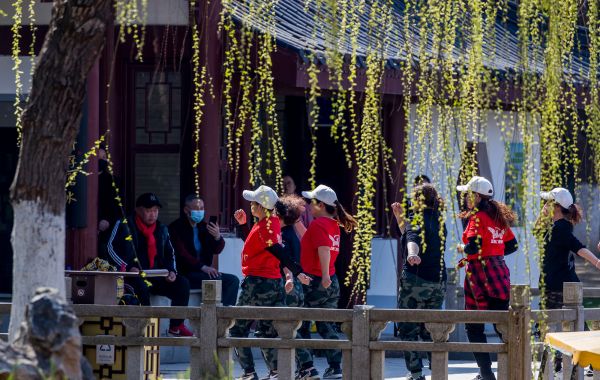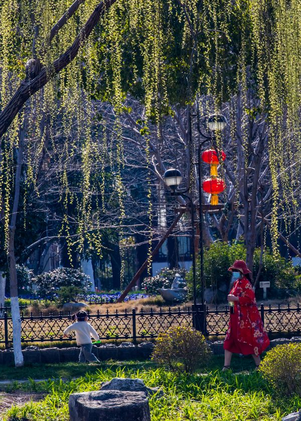 在堤角公园,摄影师韩昶光拍下了市民赏春光的场景,早樱盛放,垂柳发出新叶,随风轻摆枝条,春色满园。年轻人跳起鬼步舞,孩子们肆意奔跑在阳光下。