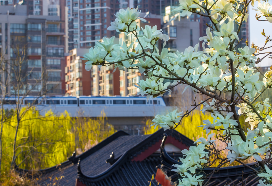 堤角公园,白玉兰盛放,远处一列轻轨驶过。城市摄影队 陈利安 摄