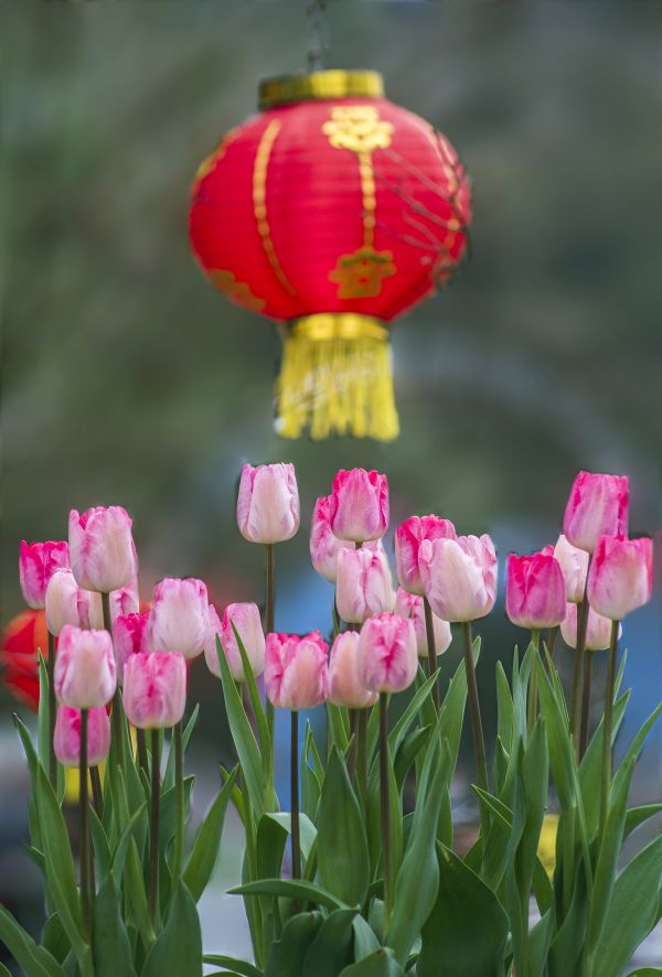 解放公园郁金香和红灯笼。城市摄影队 邹幼勤 摄
