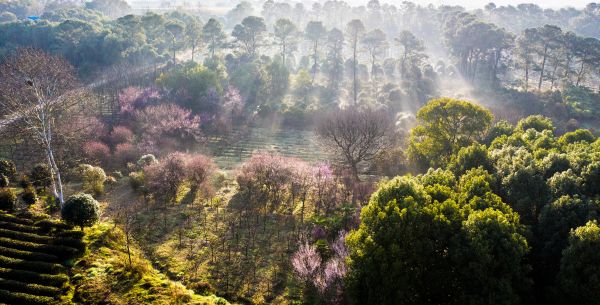 早上7时,摄影师赵广亮来到东湖梅园旁的揽翠茶园,用无人机进行拍摄。太阳刚刚升起,林间弥漫着雾气,晨曦薄雾中,揽翠茶园中的茶树与盛开的梅花交相辉映,宛如仙境。赵广亮说,走进茶园会感到空气很甜,风中不时飘来梅花淡淡的清香,茶树葱郁,梅花盛放,好一派春光。