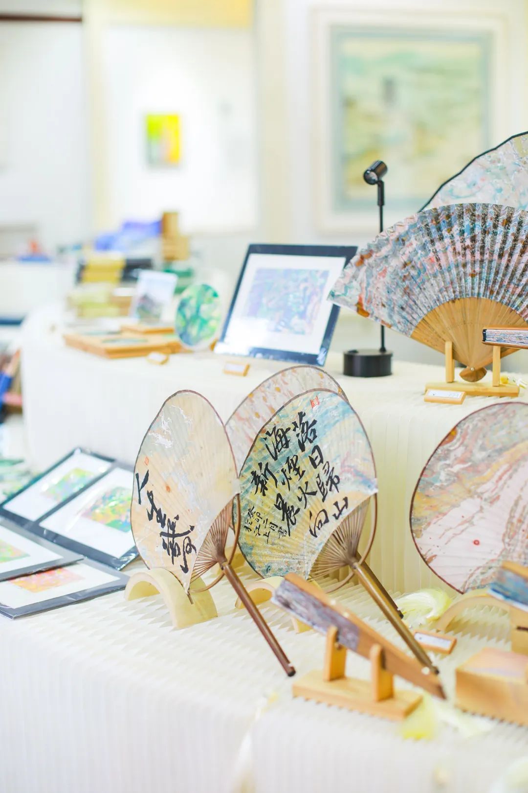 弧度灵动的展台上,摆放着好些古风蒲扇、明信片、纸雕等作品。其中明信片上有武汉许多热门打卡点的早期风貌。