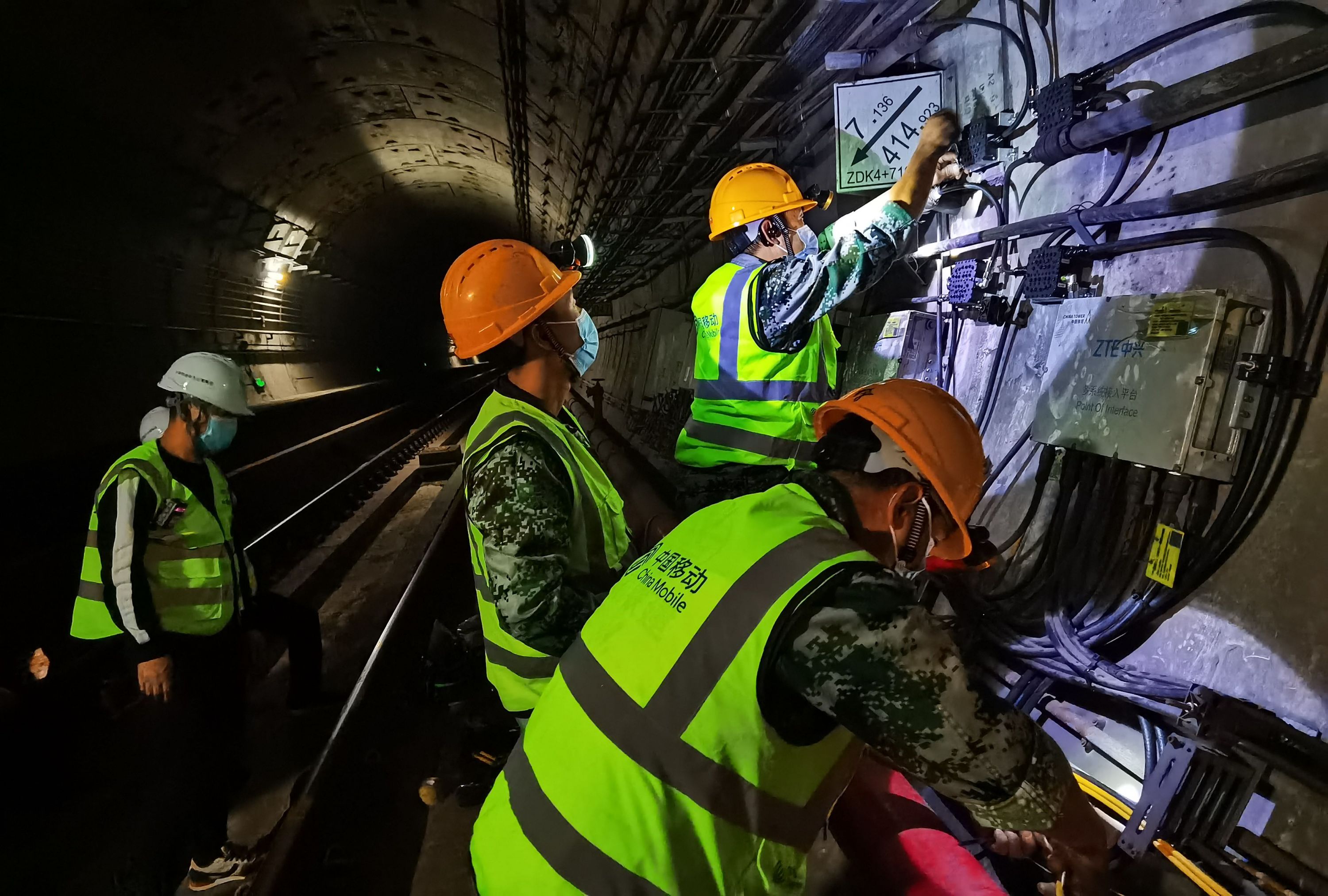 图:武汉移动网络建设人员在地铁8号线内施工。