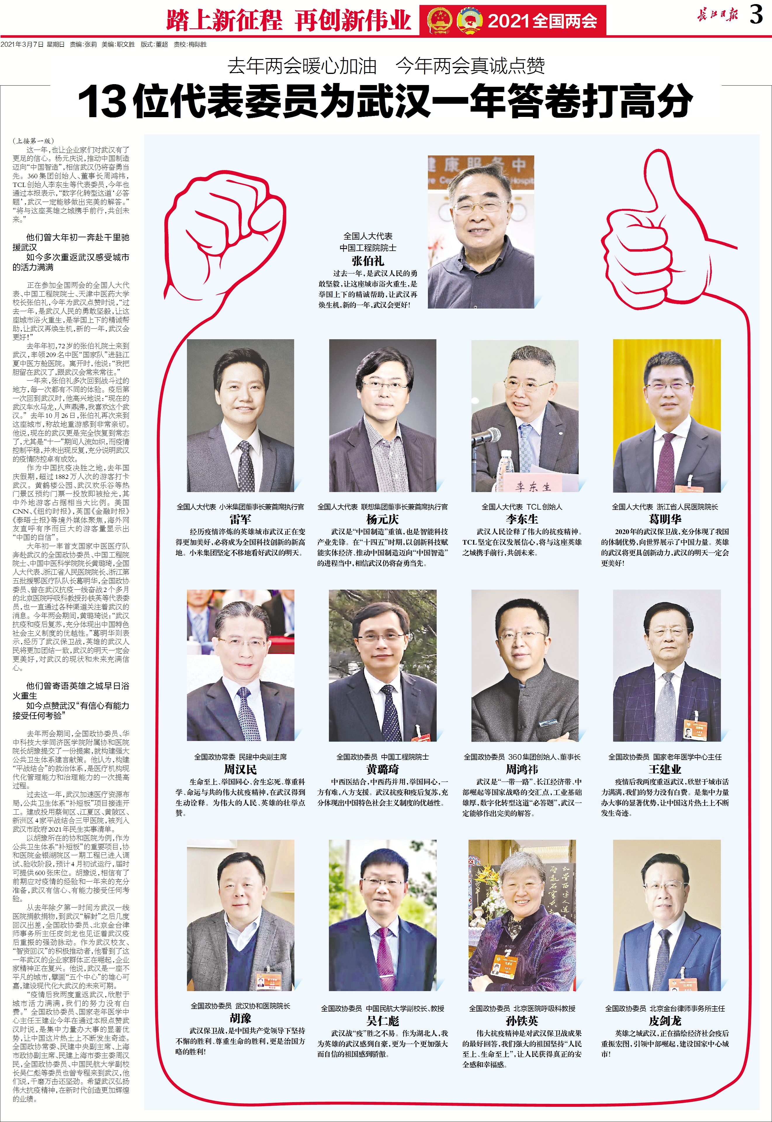 这一年,也让企业家们对武汉有了更足的信心。杨元庆说,推动中国制造迈向“中国智造”,相信武汉仍将奋勇当先。360集团创始人、董事长周鸿祎,TCL创始人李东生等代表委员,今年也通过本报表示,“数字化转型这道‘必答题’,武汉一定能够做出完美的解答。”“将与这座英雄之城携手前行,共创未来。”