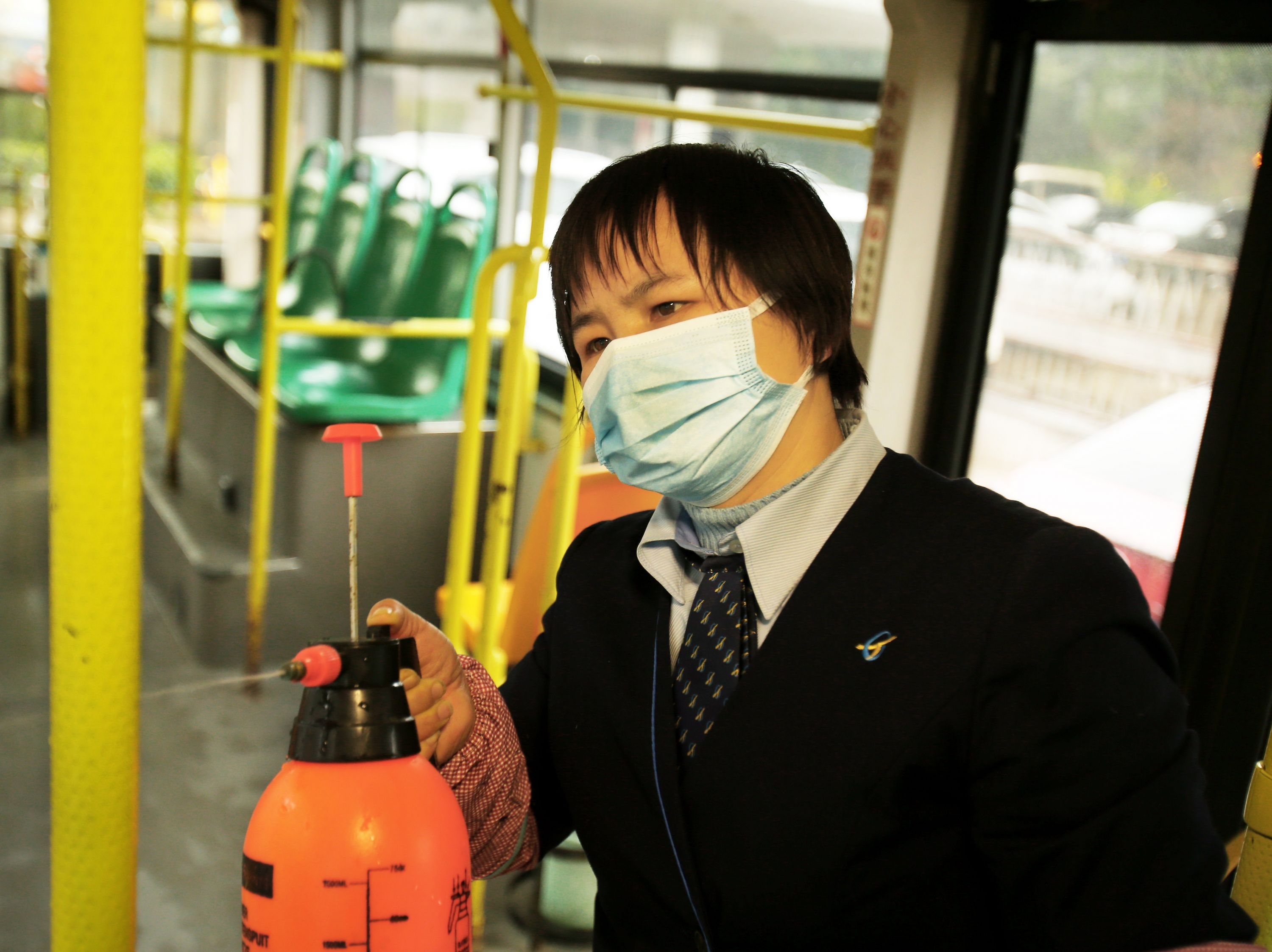 公交290路党员司机赵秀丽在去年战疫期间,承担接送援汉医疗队员上下班的任务,与队员们同住在一处,执行24小时的备勤保障。图为运营结束后,她仔细为车厢消杀。
