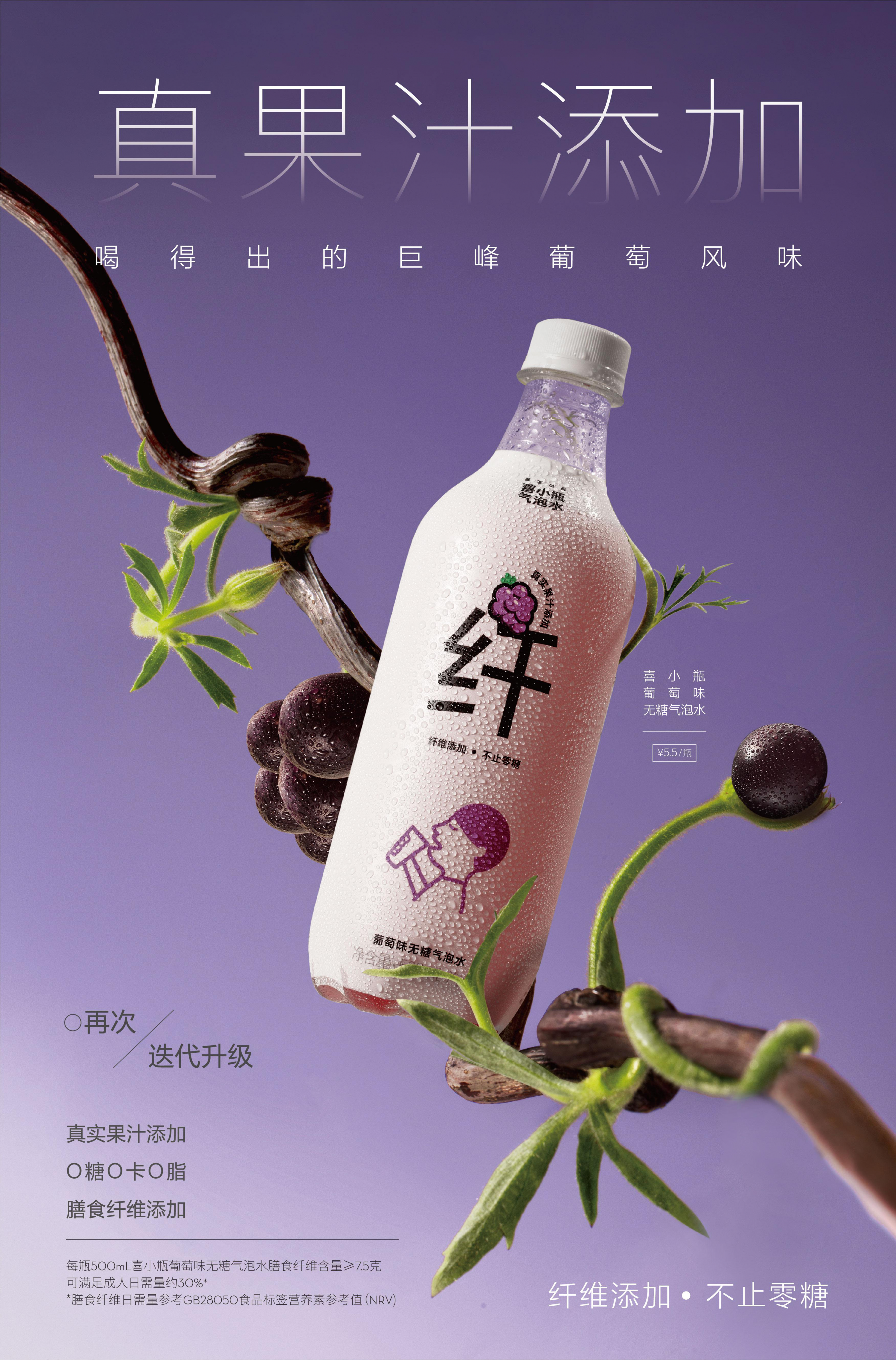 喜小瓶本次推出的新升级葡萄口味无糖气泡水,延续了“纤维添加,不止零糖”的健康主张,新升级的葡萄口味无糖气泡水在原来的基础上添加了葡萄果汁,同时,由于添加了不含任何人工合成色素的葡萄浓缩汁和紫胡萝卜浓缩汁,其颜色更贴近葡萄实际的颜色。一个醒目的“纤”字在瓶身正面,让爱吃又不想胖的年轻人能够更直观了解到喜小瓶添加膳食纤维,不止零糖。