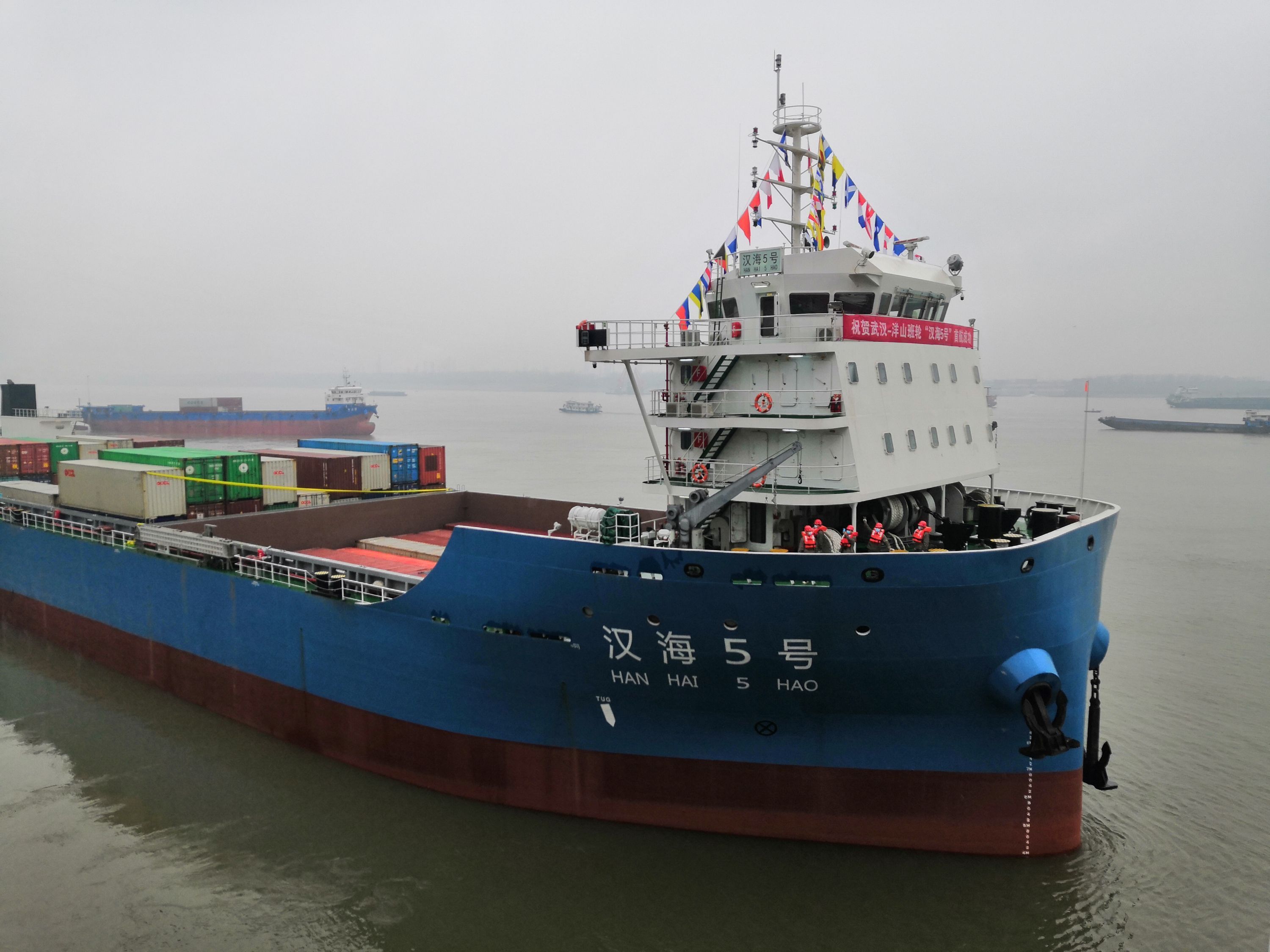 “汉海5号”轮是唯一的一艘有武汉国有企业投资,在湖北建造的国内最先进、最大装载量的江海直达集装箱船。