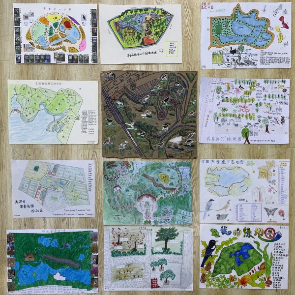 四(1)班徐晗菲同学观察的是常青花园社区的中心公园,她沿着外围步道一边走一边拍,记录植物的名称:“一开始觉得公园很小,不会有太多植物,后来发现仅仅这一圈小路上就有几十种植物,多得画不下了。原来我们的社区这么美。”六(3)班张曦文同学说:“通过这次活动,我又重新认识了大自然。如果不是绘制绿地图,我可能不会发现这个去过好多次的公园有那么多的鸟类和植物。再次走进金银潭湿地公园,湖泊里多了不少小动物,小蝌蚪、蜻蜓、野鸭,甚至还有黑天鹅。”六(3)班腾知语同学通过观察、走访、记录,了解到小区的整体结构和规划,培养了方向感和空间感。