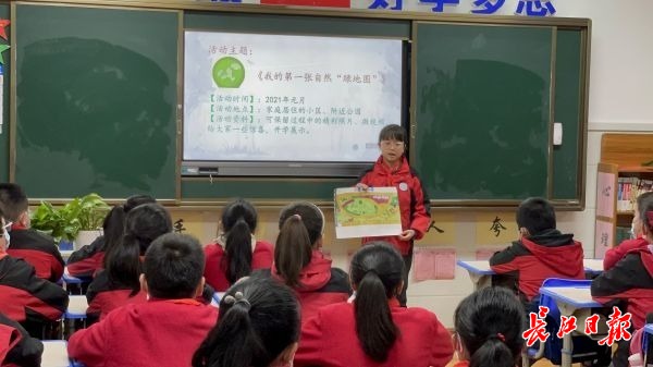 科学课上,同学们分享自己在小区挖“宝藏”后创作的生态绿地图。长江日报记者杨幸慈 摄
