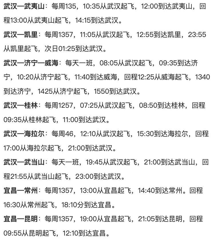 南航武汉至广州快线,每天多达10班,每天最早08:00、最晚20:30从武汉机场起飞,飞行时间约1小时45分钟;武汉至北京大兴快线,每天6班,每天最早08:00、最晚22:00从武汉机场起飞,飞行时间约2小时,能满足旅客随到随走的出行需求。此外,南航使用豪华宽体客机B787执飞武广、武京快线。