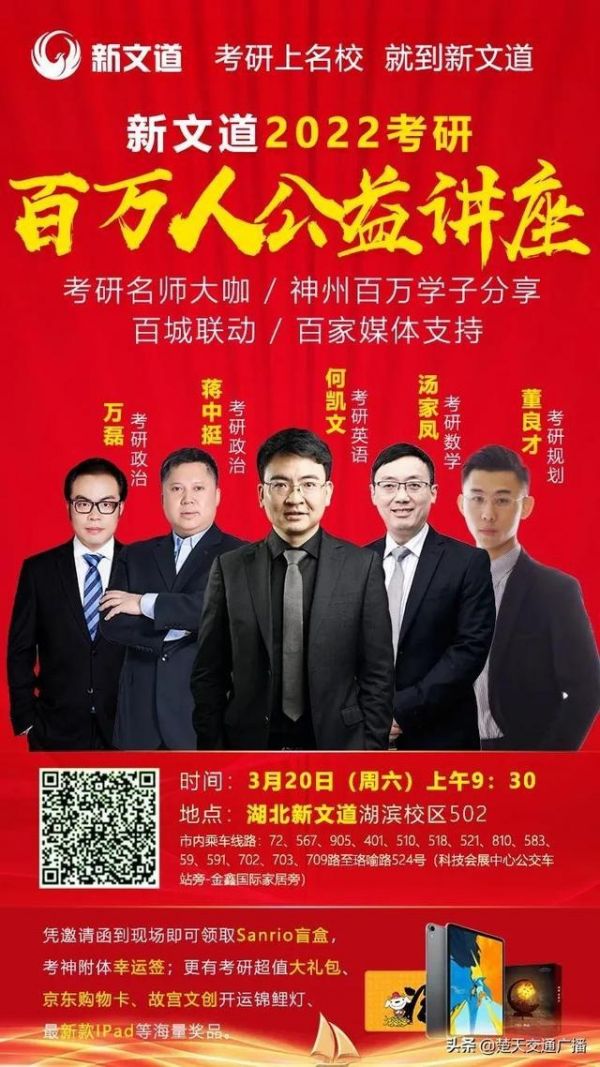 3月20日上午9:30,2022考研百万人公益讲座在湖北新文道湖滨校区盛大举行。考研名师何凯文、汤家凤、蒋中挺、万磊、董良才齐聚武汉,多学科全方位剖析2022考研新趋势,详细解读2022考研最新政策,手把手讲授如何择校选专业、如何制定科学的复习目标和计划,如何提高复习效率。