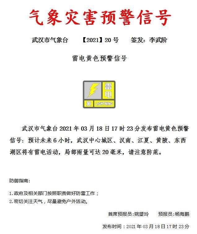 今天,武汉市气象台17时23分发布雷电黄色预警信号:预计未来6小时,武汉中心城区、汉南、江夏、黄陂、东西湖区将有雷电活动,局部雨量可达20毫米,请注意防范。