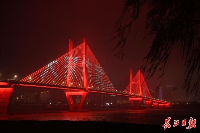 19日晚,武汉长江灯光秀,长江二桥上亮起“大武汉客户端上线”字样。