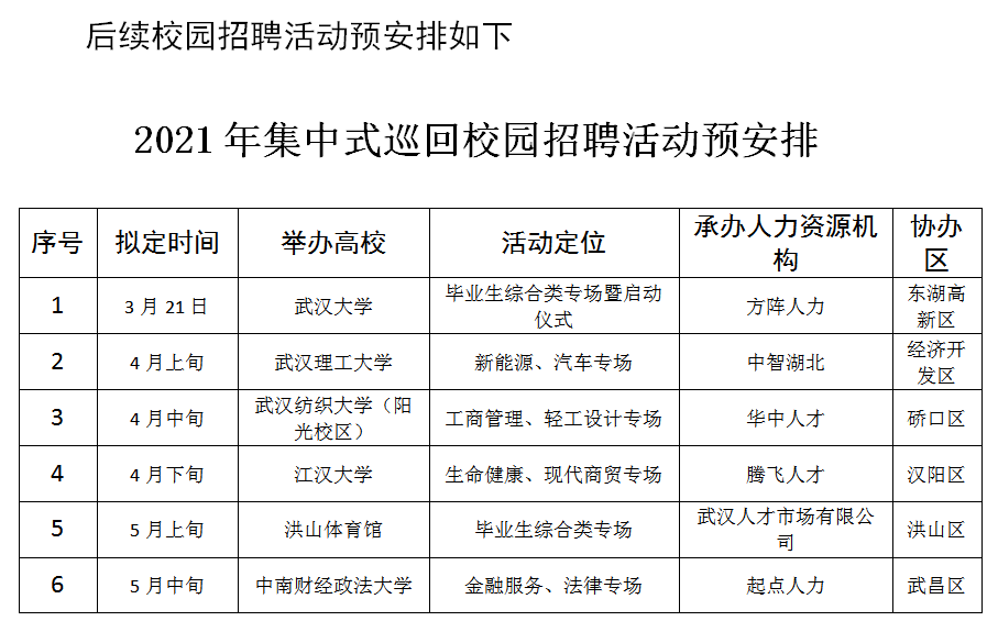 为深入实施人才强市战略,落实就业优先政策,加快推进“学子留汉”工程,促进高校毕业生更加充分更高质量就业,为打造“五个中心”、建设现代化大武汉吸引留下更多青年大学生,根据市委、市政府工作部署,定于3月21日上午9:30在武汉大学工学部体育馆,开展以“就在武汉、创赢未来”为主题的2021年大学生就业招聘系列活动。