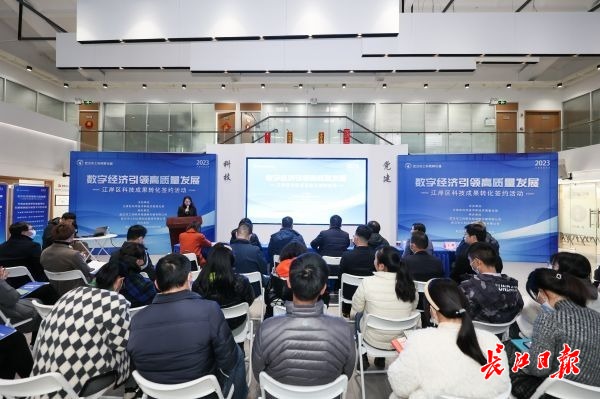 由江岸区科经局主办,武汉市工科院科技园孵化器、科创空间承办的2023年“数字经济引领高质量发展”江岸区首场科技成果转化签约活动现场。 通讯员吴佳妮 摄