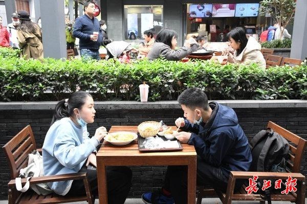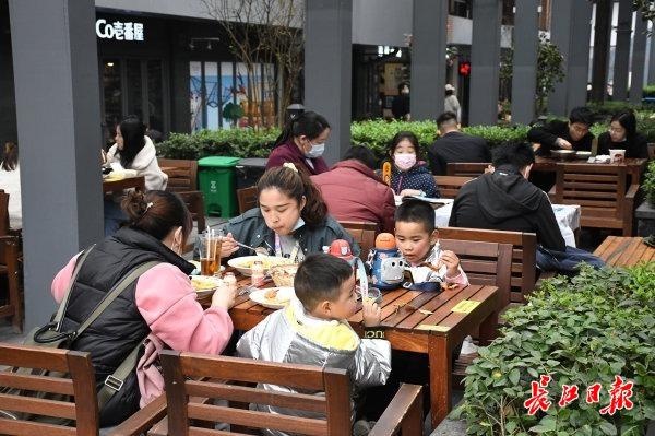 长江日报3月20日讯 3月20日,在黄浦路武汉天地看到,户外商业街上,最火爆的当属各种餐饮美食店,不管是国内川菜粤菜还是西餐等餐饮都是十分火爆,同时各种美食小店也成为了人们的目标,约上亲朋一起在春风和煦的双休一起美美地享受一桌美食,显得十分惬意。 (记者詹松 摄影报道)