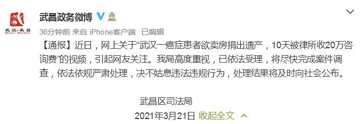 据武汉市武昌区官方微博@武昌政务微博 消息,武昌区司法局3月21日发布通报:近日,网上关于“武汉一癌症患者欲卖房捐出遗产,10天被律所收20万咨询费”的视频,引起网友关注。我局高度重视,已依法受理,将尽快完成案件调查,依法依规严肃处理,决不姑息违法违规行为,处理结果将及时向社会公布。