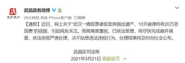 【通报】近日,网上关于“武汉一癌症患者欲卖房捐出遗产,10天被律所收20万咨询费”的视频,引起网友关注。我局高度重视,已依法受理,将尽快完成案件调查,依法依规严肃处理,决不姑息违法违规行为,处理结果将及时向社会公布。