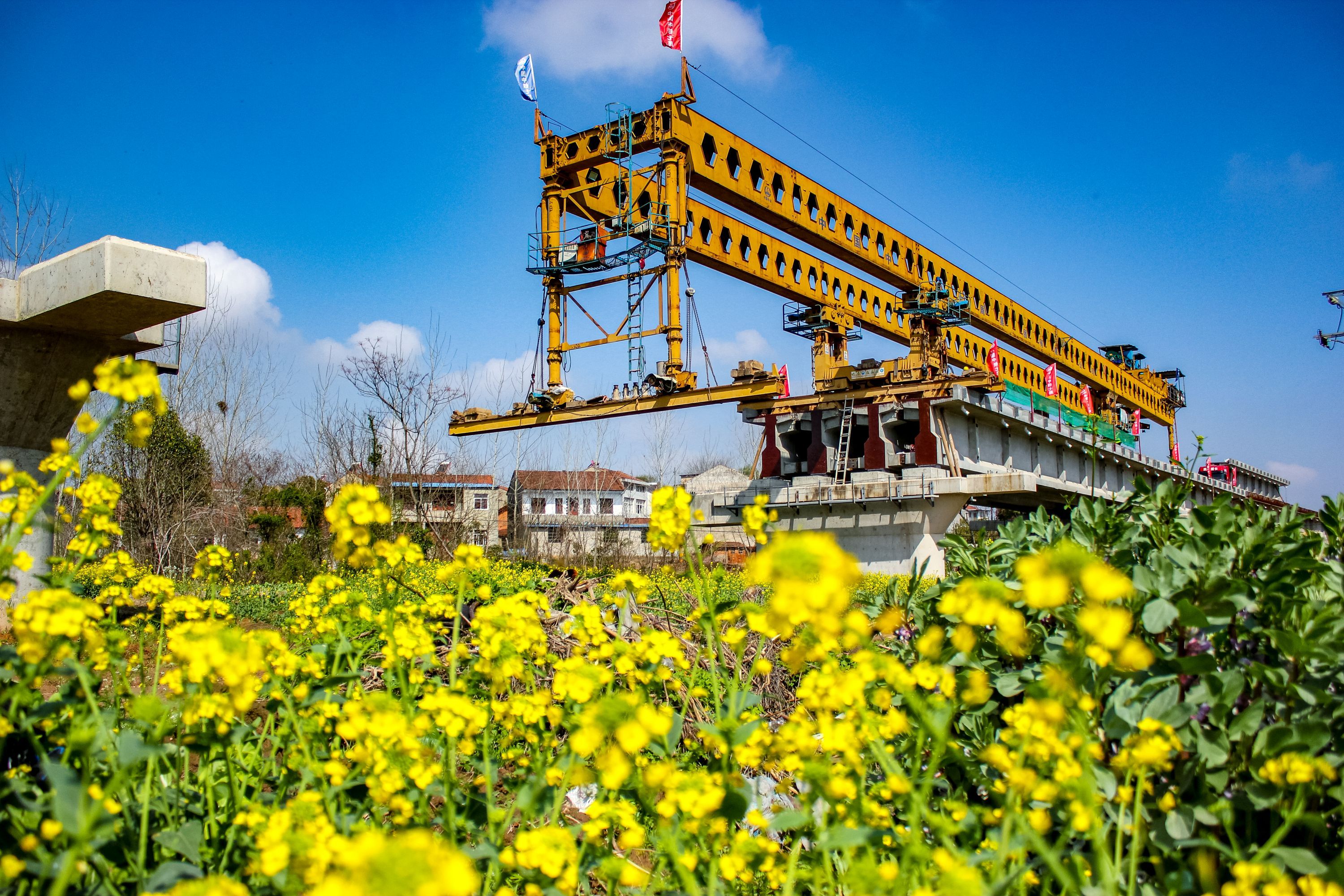 ◇ 在武汉新港江北铁路倒水河特大桥架梁施工现场,施工人员正加紧进行架梁施工,预计今年8月前能完成倒水河特大桥架梁施工。