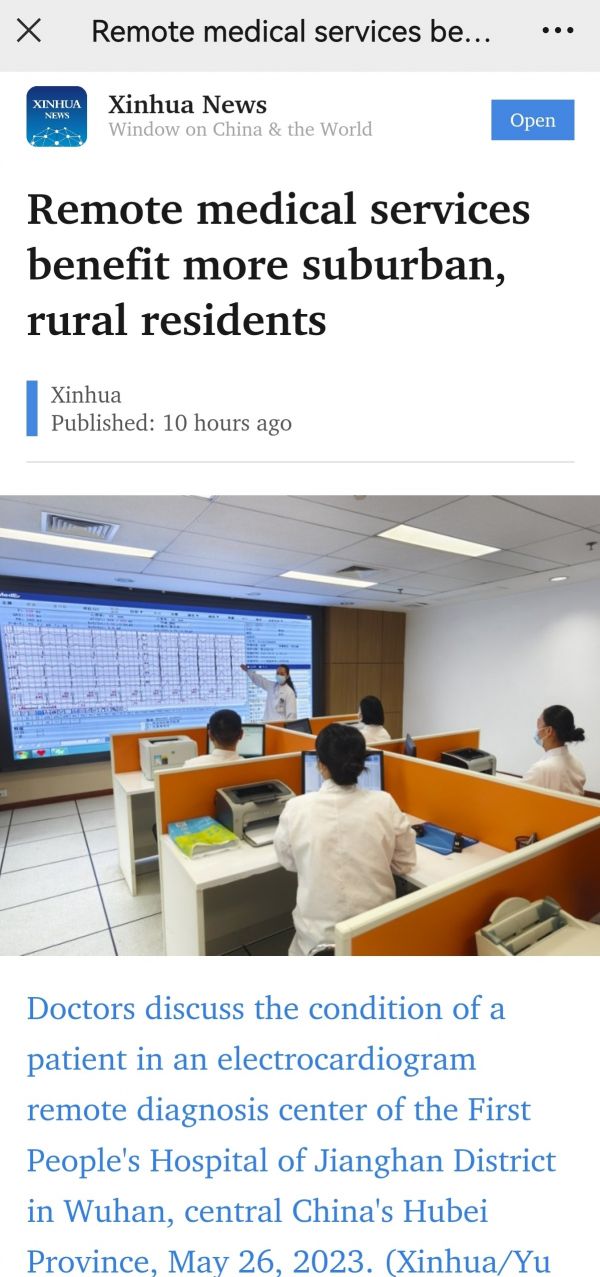 长江日报大武汉客户端6月2日讯 6月1日,新华社英文版以“远程医疗服务惠及更多郊区和农村居民”为题,向全球介绍武汉市江夏区远程心电、远程影像集中诊断,夯实农村医疗卫生体系的做法。